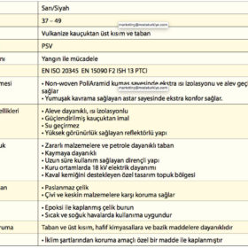 CE Class 1 Çelik burun BS EN :1998 200 Joule dayanıklı Aleve dayanıklı dış yüzey Aleve dayanıklı tutma kolları Tüm iç yüzey ısıya dayanıklılık sağlayan Kevlar / Nomex astarla kaplanmıştır Kaval kemiği koruması Bilek koruma dolgusu İç kısım sünger yapıdadır Reflektör şerit sayesinde yüksek görünürlük Paslanmaz çelik ara taban sayesinde ekstra taban koruma Güçlendirilmiş çelik burun Delinmelere karşı korumalı çelik ara taban Yağa, petrole ve aleve dayanıklı, elektrik şoklarına dayanıklı taban.
